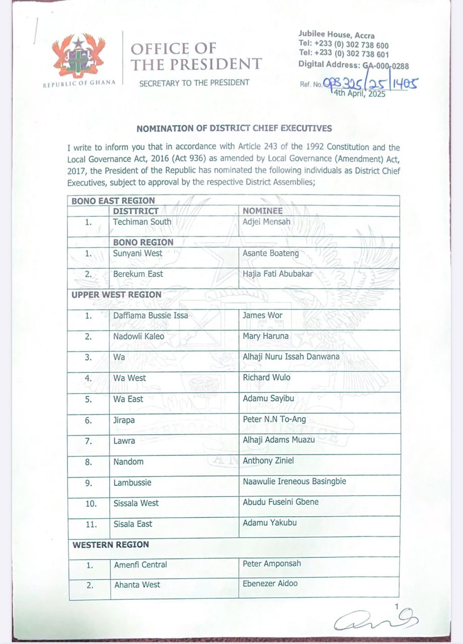 “I write to inform you that in accordance with Article 243 of the 1992 and the Local Governance Act, 2016 (Act 936) as amended by the Local Governance (Amendment) Act, 2017, the President of the Republic has nominated the following individuals as District Chief Executives, subject to approval by the respective District Assemblies,” said the statement.