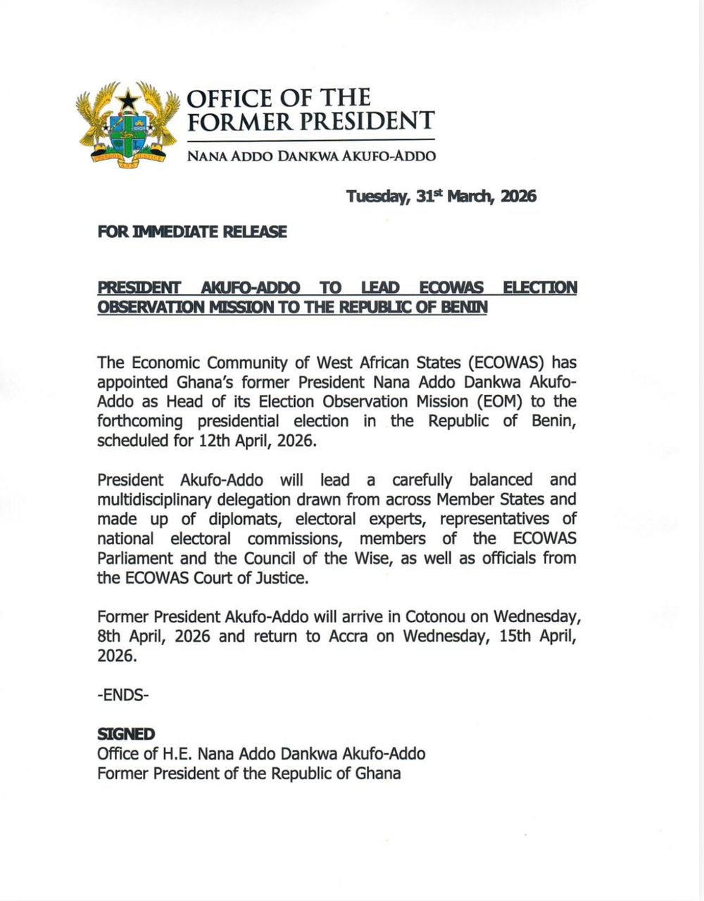 “The Economic Community of West African States has appointed Ghana’s former President Nana Addo Dankwa Akufo-Addo as head of its election observer mission to the forthcoming presidential election in the Republic of Benin, scheduled for April 12, 2026,” read the statement.
