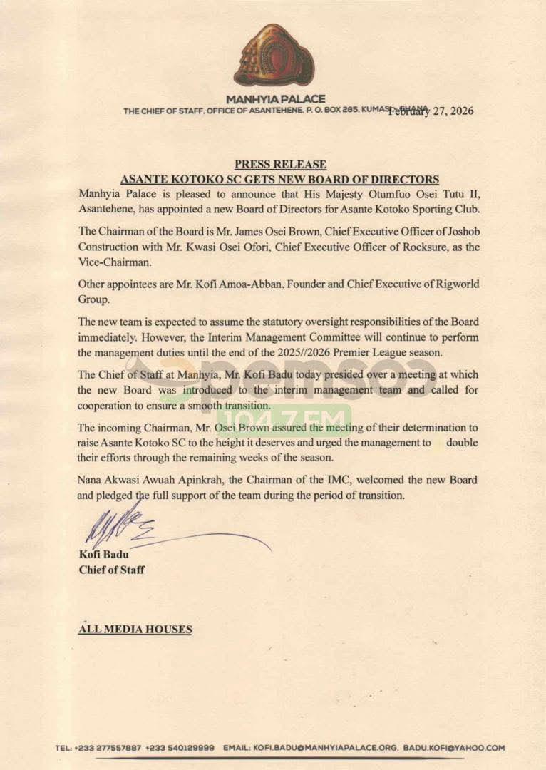 An official statement from Manhyia Palace confirming the appointment of the new board on Friday, February 27, said, “His Majesty Otumfuo Osei Tutu II, Asantehene, has appointed a new Board of Directors for Asante Kotoko Sporting Club.