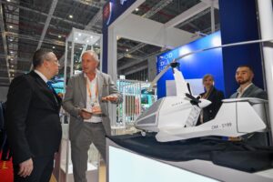 An exhibitor (2nd L) introduces an aircraft product to a visitor (1st L) at the Slovakia Pavilion of the eighth China International Import Expo (CIIE) in east China’s Shanghai, Nov. 5, 2025. (Xinhua/Chen Haoming)