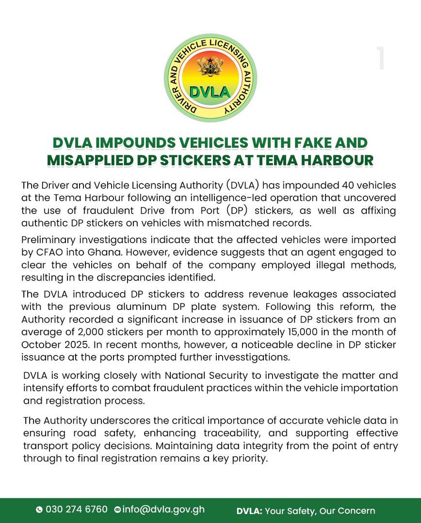 “The Driver and Vehicle Licensing Authority has impounded 40 vehicles at the Tema Harbour following an intelligence-led operation that uncovered the use of fraudulent Drive from Port stickers, as well as affixing authentic DP stickers on vehicles with mismatched records,” read the statement.