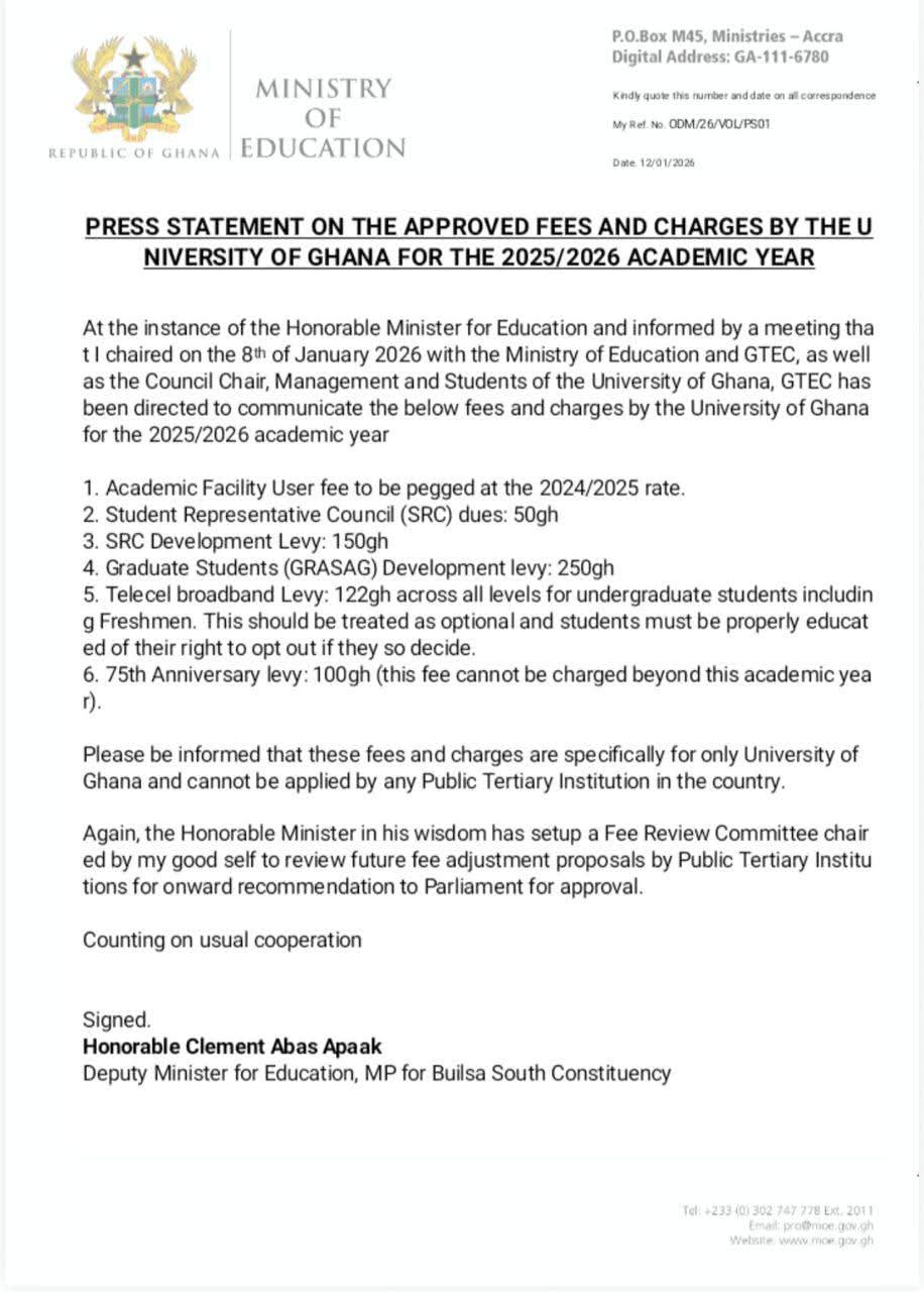 The statement, signed by Hon. Clement Abas Apaak, Deputy Minister for Education and Member of Parliament (MP) for Builsa South Constituency, noted that the fees are specifically for University of Ghana students and cannot be applied by any other public tertiary institution in the country.