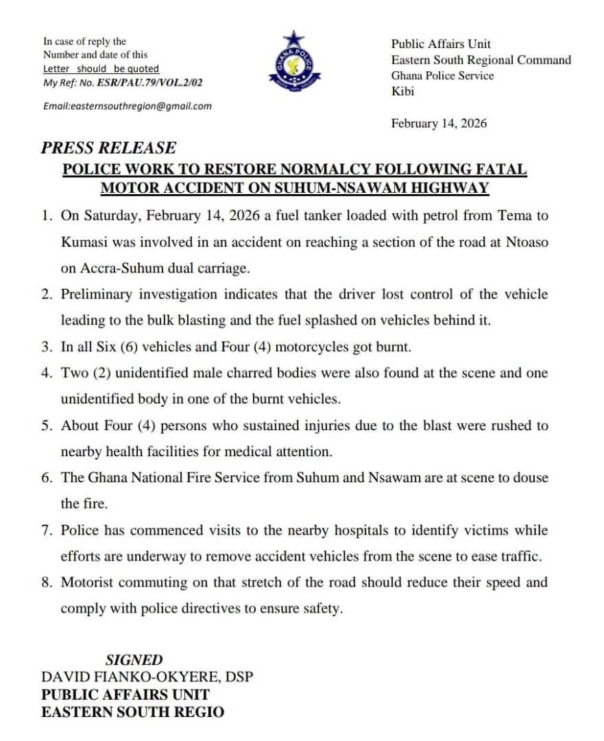 “On Saturday, February 14, 2026 a fuel tanker loaded with petrol from Tema to Kumasi was involved in an accident on reaching a section of the road at Ntoaso on the Accra-Suhum dual carriage road. Two unidentified male charred bodies were also found at the scene and one unidentified body in one of the burnt vehicles,” read the statement.