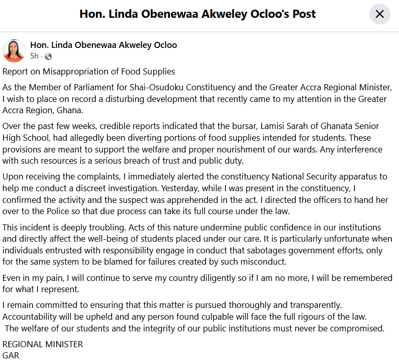The bursar of Ghanata Senior High School (SHS), Lamisi Sarah, has been arrested for allegedly diverting food supplies meant for students, Member of Parliament for Shai-Osudoku and Greater Accra Regional Minister, Linda Ocloo, confirmed in a post.
