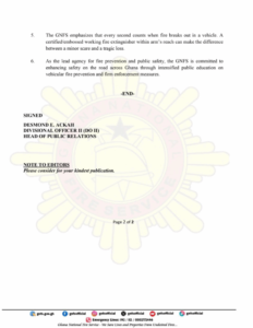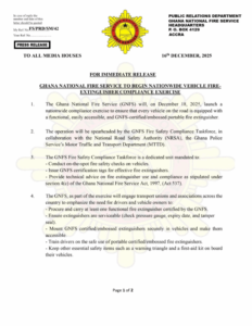 The statement, signed by Desmond E. Ackah, Divisional Officer II (DO II), announced that the operation will be led by the GNFS Fire Safety Compliance Taskforce in collaboration with the National Road Safety Authority (NRSA) and the Motor Traffic and Transport Department (MTTD) of the Ghana Police Service.