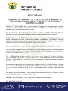 According to the statement released by the Ministry of Foreign Affairs, the government expressed concern about how Ghanaian travellers to Israel have been maltreated.