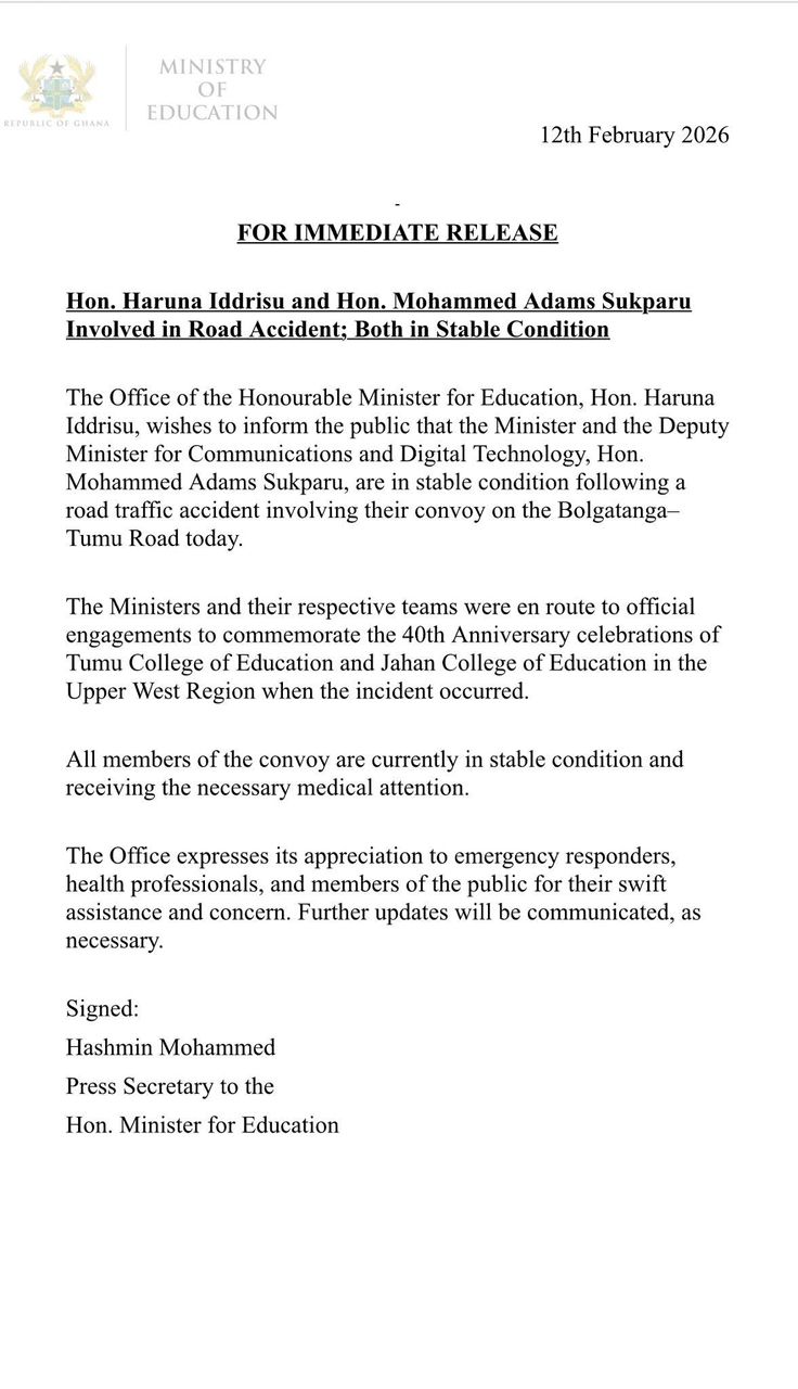 The statement, signed by Hashmin Mohammed, announced that the accident occurred on the Bolgatanga-Tumu road when the two ministers were on their way to an official event at the Tumu College of Education and Jahan College of Education in the Upper West Region.