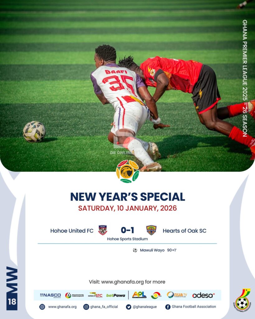Accra Hearts of Oak struck late to pick all three points against Hohoe United in matchday 18 of the Ghana Premier League (GPL) at the Hohoe Stadium on Saturday.