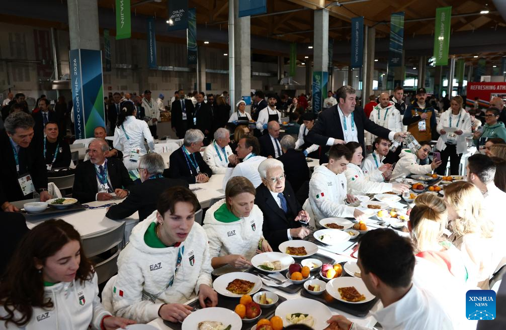 Italian President Sergio Mattarella eats with Italian athletes during his visit to the Olympic Village ahead of the 2026 Milan-Cortina Winter Olympics in Milan, Italy, Feb. 5, 2026. (Yara Nardi/Pool via Xinhua)