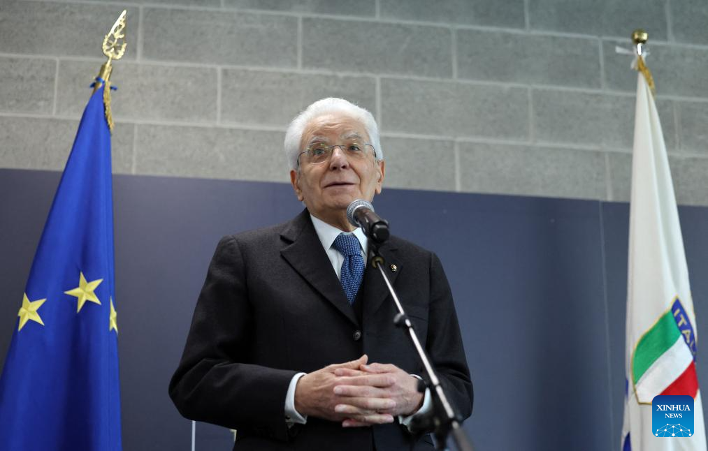 Italian President Sergio Mattarella gives a speech during his visit to the Olympic Village ahead of the 2026 Milan-Cortina Winter Olympics in Milan, Italy, Feb. 5, 2026. (Yara Nardi/Pool via Xinhua)