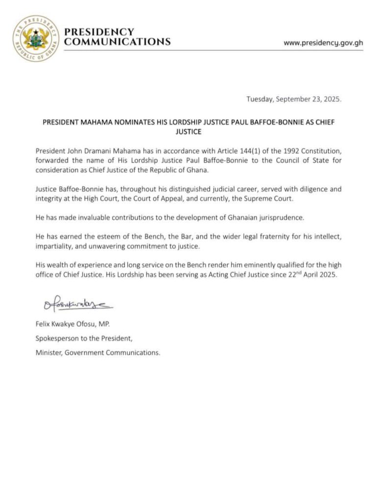 “President John Dramani Mahama has, in accordance with Article 144 (1) of the 1992 Constitution, forwarded the name of His Lordship Justice Paul Baffoe-Bonnie to the Council of State for consideration as Chief Justice of the Republic of Ghana,” read the statement.