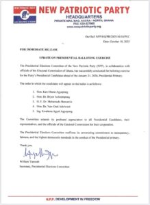“The Presidential Elections Committee of the New Patriotic Party, in collaboration with officials of the Electoral Commission of Ghana, has successfully conducted the balloting exercise for the party’s presidential candidates ahead of the January 31, 2026, presidential primary. The order in which the candidates will appear on the ballot is as follows:
