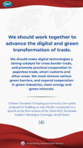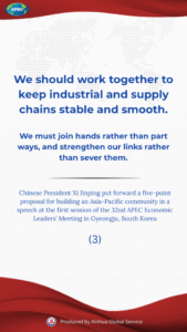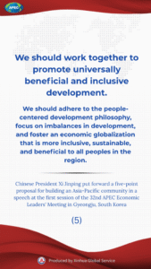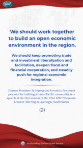 Chinese President Xi Jinping on Friday put forward a five-point proposal for promoting a universally beneficial and inclusive economic globalization and building an Asia-Pacific community at the first session of the 32nd APEC Economic Leaders’ Meeting.