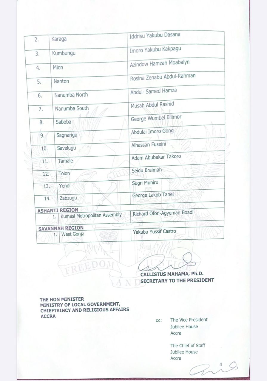 The statement signed by Callistus Mahama, Secretary to the President said the nominations are subject to the approval of the respective District Assemblies.