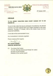 The swearing-in of newly selected High Court Judges scheduled for today, October 8, has been postponed indefinitely, a statement from the Judicial Secretary confirmed on Friday.