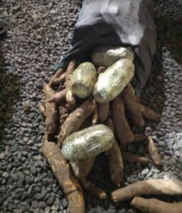 According to the police, personnel were quickly dispatched to the scene, where they retrieved the sack, which was brought to the station, after which a search was conducted in the presence of the suspect, which revealed 18 compressed slabs suspected to be Indian hemp concealed among the cassava.