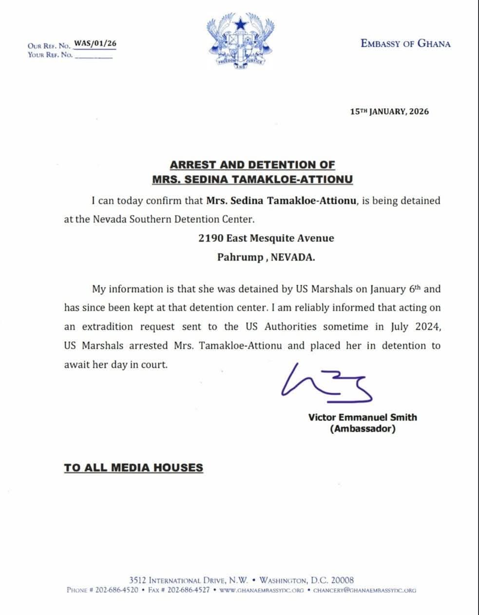 “I can today confirm that Mrs Sedina Tamakloe-Attionu is being detained at the Nevada Southern Detention Center, 2190 East Mesquite Avenue, Pahrump, Nevada,” read the statement.