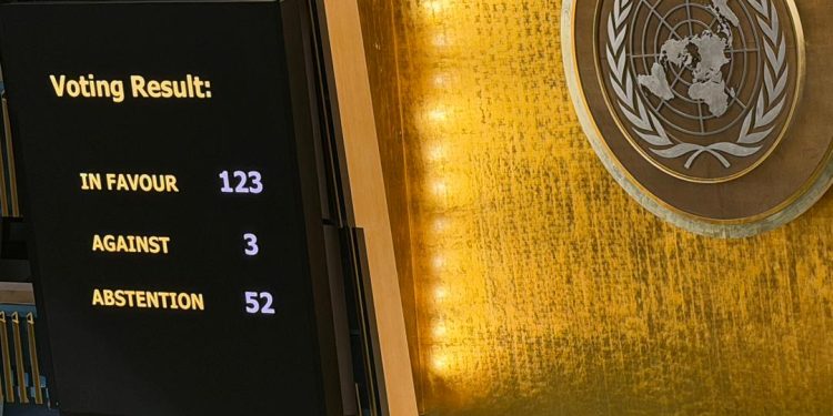 After extensive debates, the motion was adopted with 123 votes in support. Three countries—the United States, Argentina, and Israel—voted against it, while 52 nations abstained from the vote.