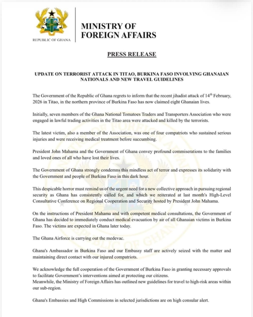 “The Government of the Republic of Ghana regrets to inform that the recent jihadist attack of 14th February, 2026 in Titao, in the northern province of Burkina Faso has now claimed eight Ghanaian lives,” read the statement.