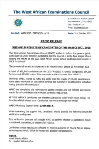 The West African Examinations Council (WAEC) said the results of 34,563 candidates who sat for the 2025 WASSCE have been either withheld or cancelled pending investigations ahead of releasing the results, according to a statement issued over the weekend.