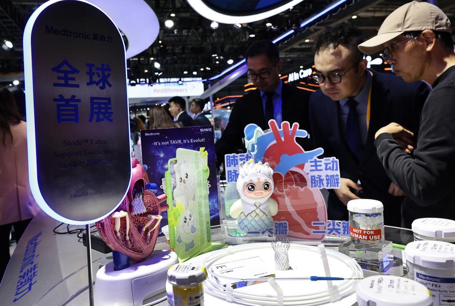 Visitors view an extra support guidewire of Medtronic, which made its global debut during the 8th China International Import Expo (CIIE) in east China’s Shanghai, Nov. 6, 2025.  (Xinhua/Fang Zhe)
