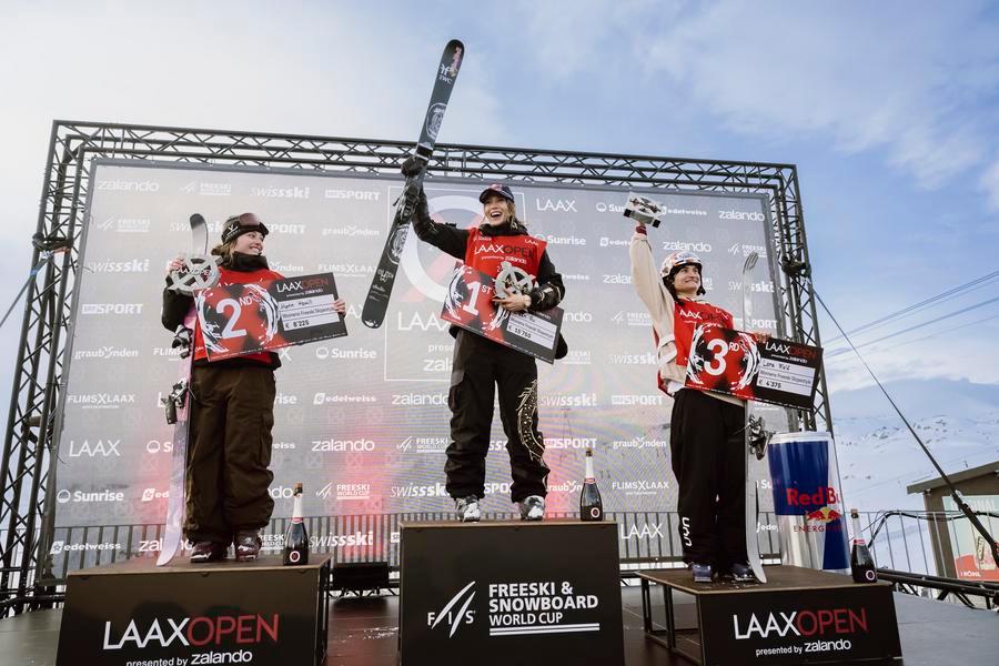 Gu Ailing (C) of China celebrates on the podium after winning the final of Freeski Slopestyle World Cup at Laax, Switzerland, Jan. 17, 2026. (Xinhua)