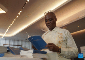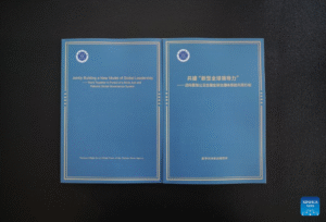 This photo taken on Nov. 13, 2025 shows a report titled “Jointly Building a New Model of Global Leadership — Work Together in Pursuit of a More Just and Rational Global Governance System” at the Global South Media and Think Tank Forum China-Africa Partnership Conference in Johannesburg, South Africa. The Xinhua Institute, a think tank affiliated with Xinhua News Agency, released the report here on Thursday. (Xinhua/Han Xu)
