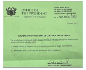 According to a letter dated April 2, 2025, signed by Callistus Mahama, Secretary to the President, it was observed that the government has suspended the grant of contract appointments.